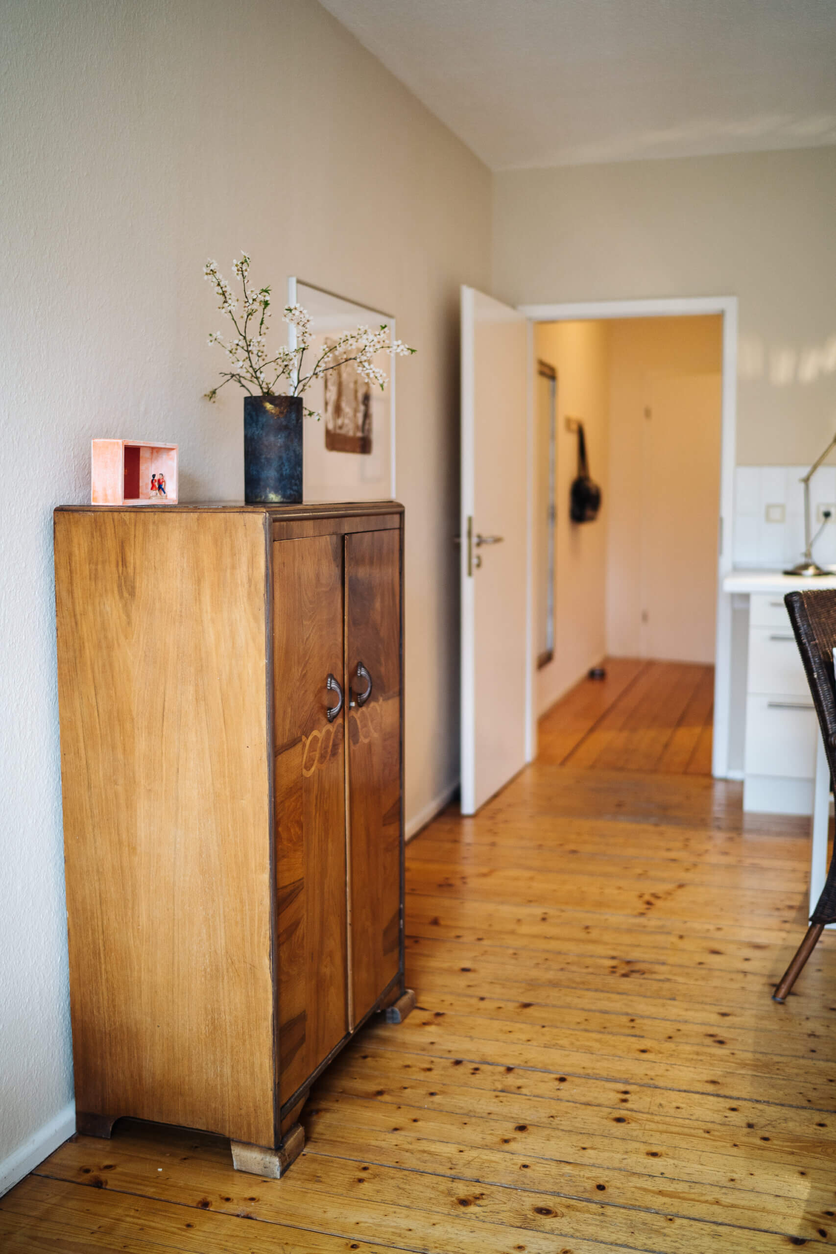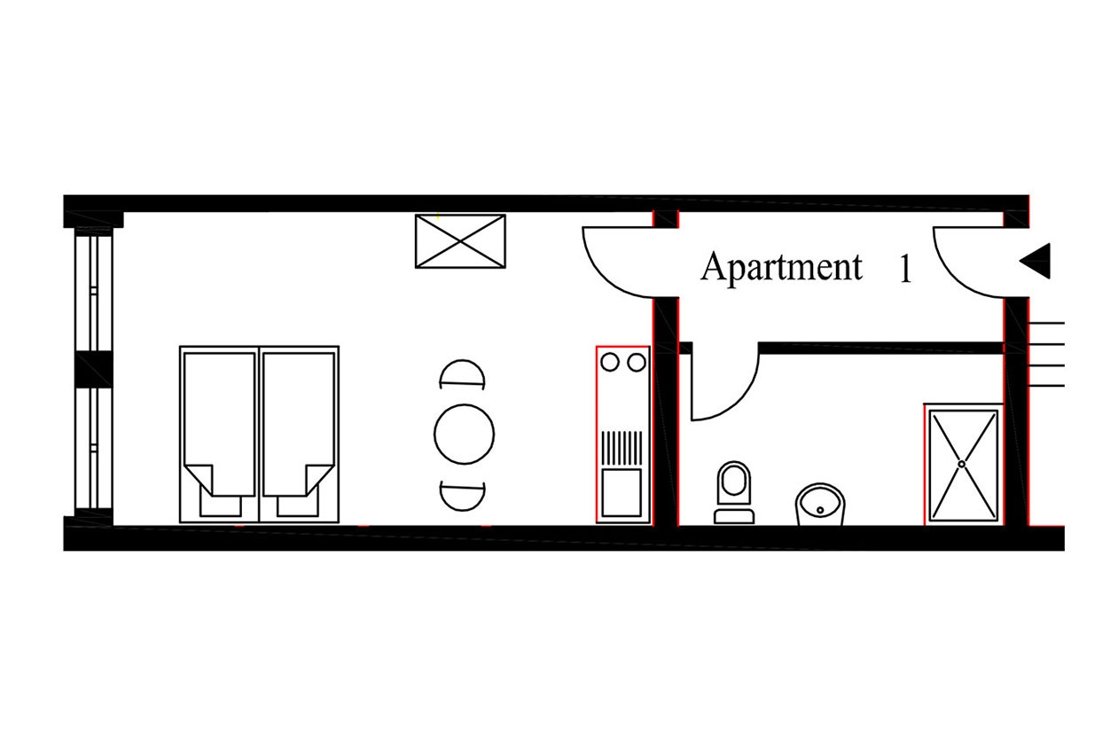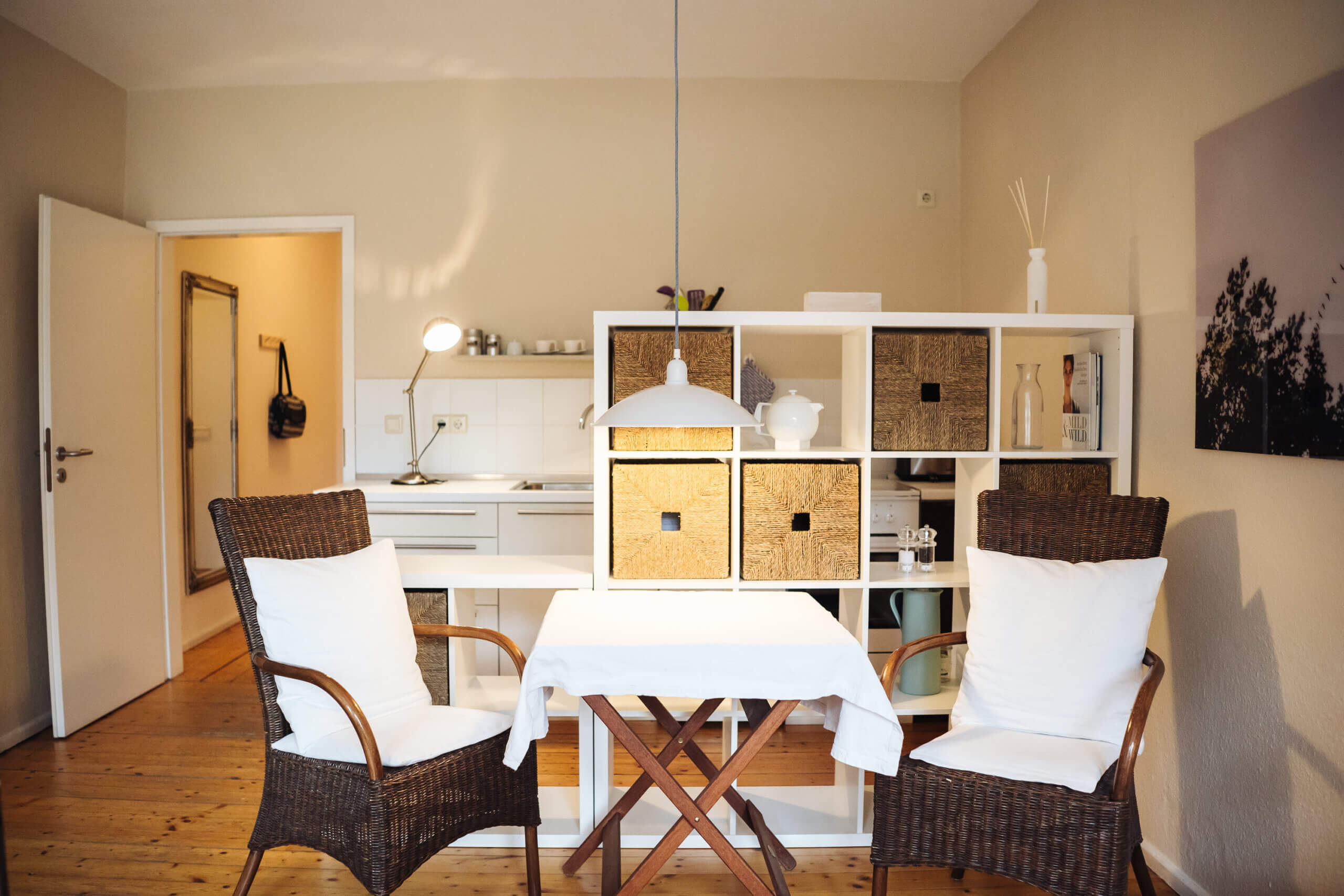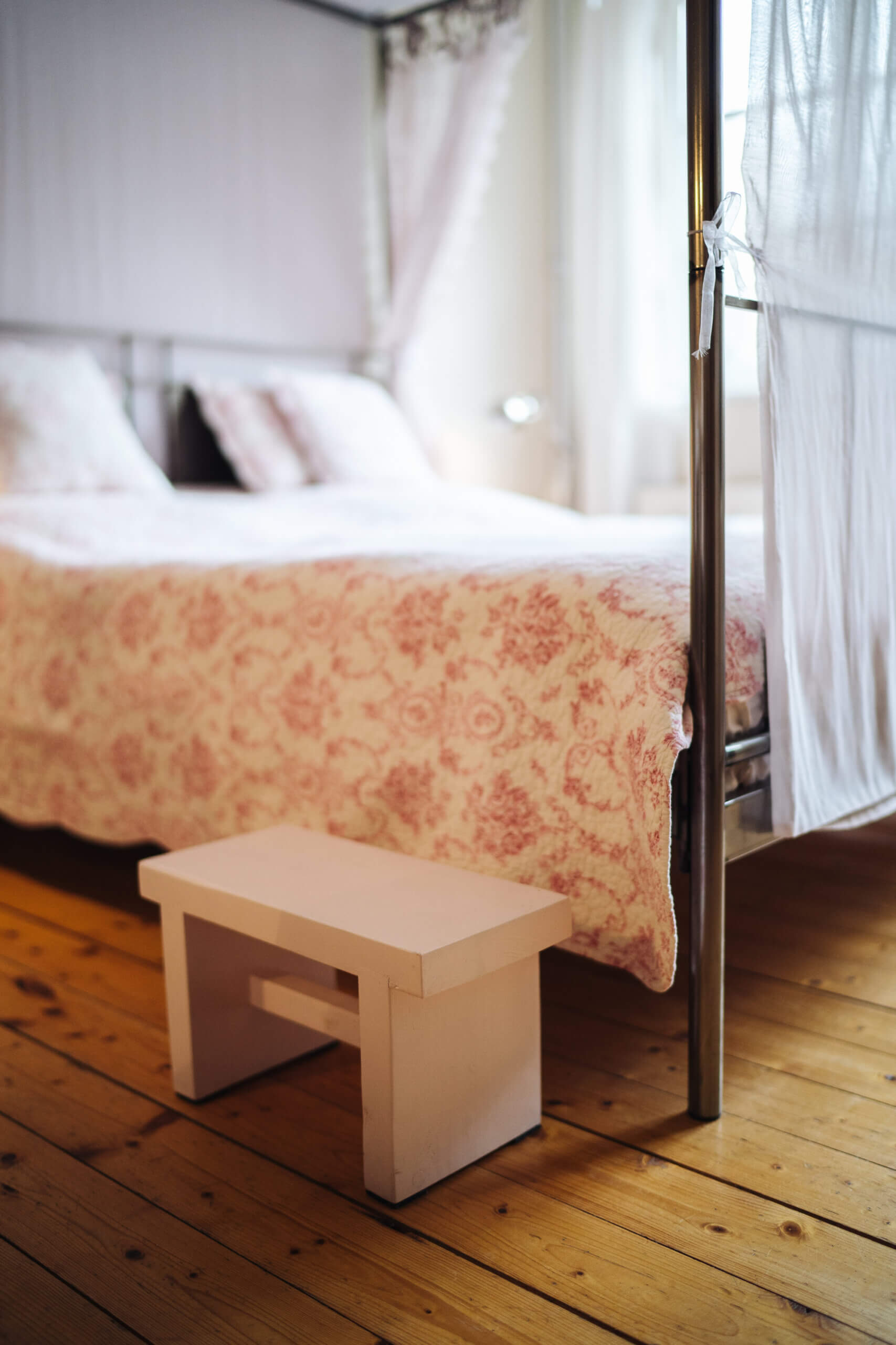 Die Ferienwohnung 1 befindet sich im Scheunengebäude im Hochparterre. Mit Himmelbett, dezenten Farben und kleiner Kochnische könnte sie als „romantisch“ beschrieben werden.