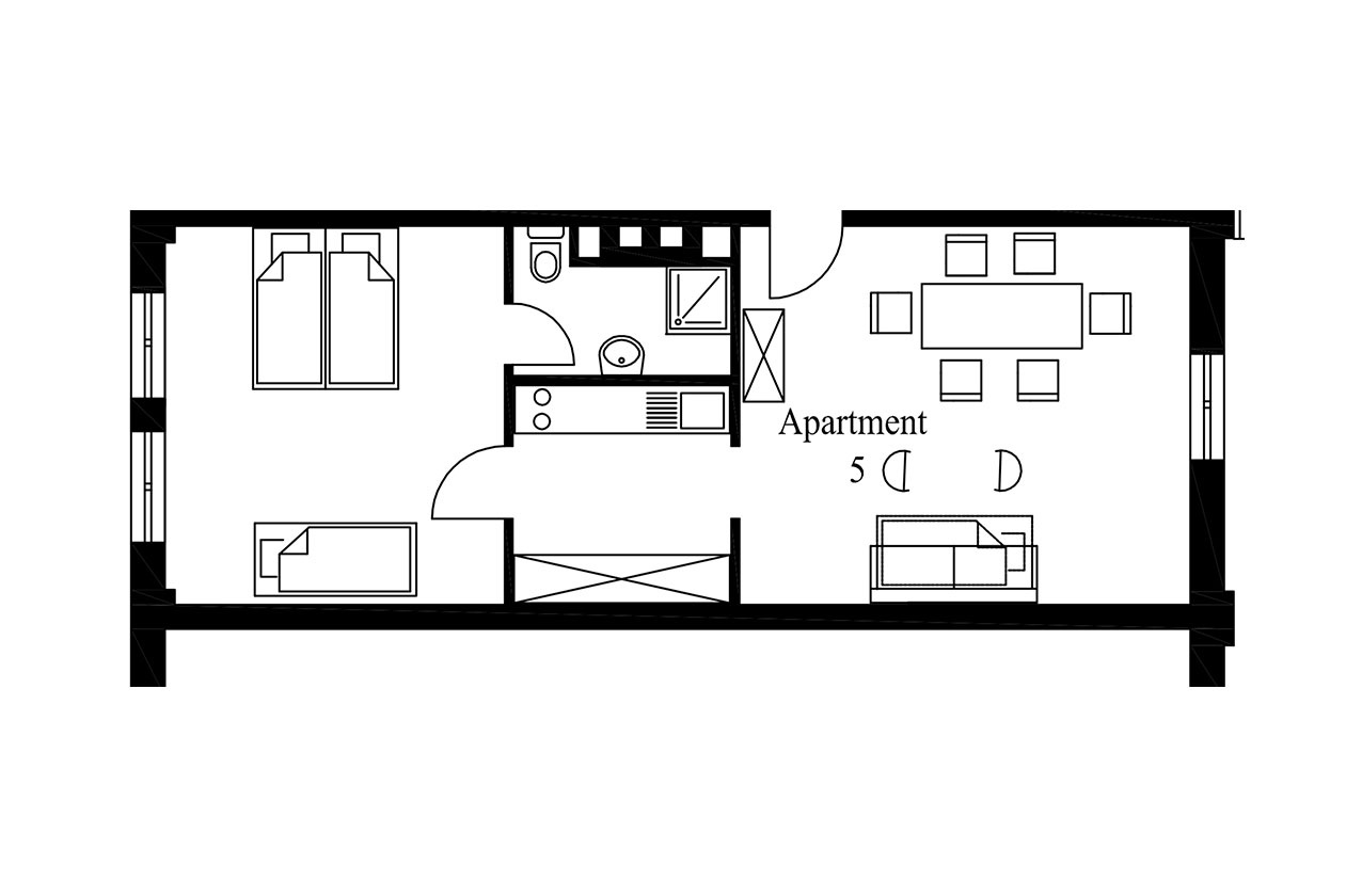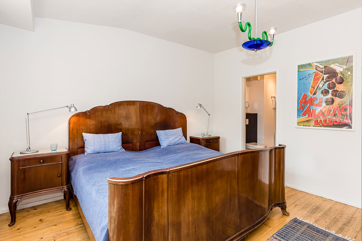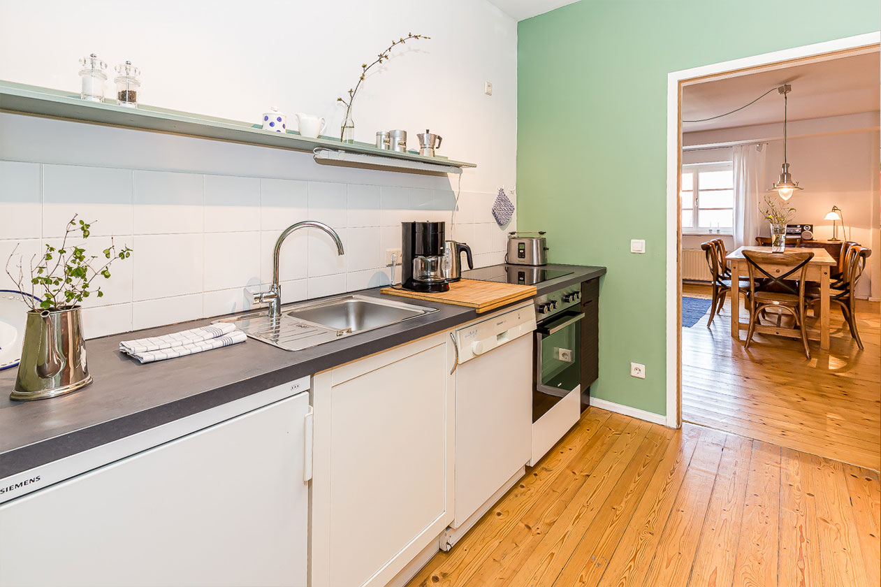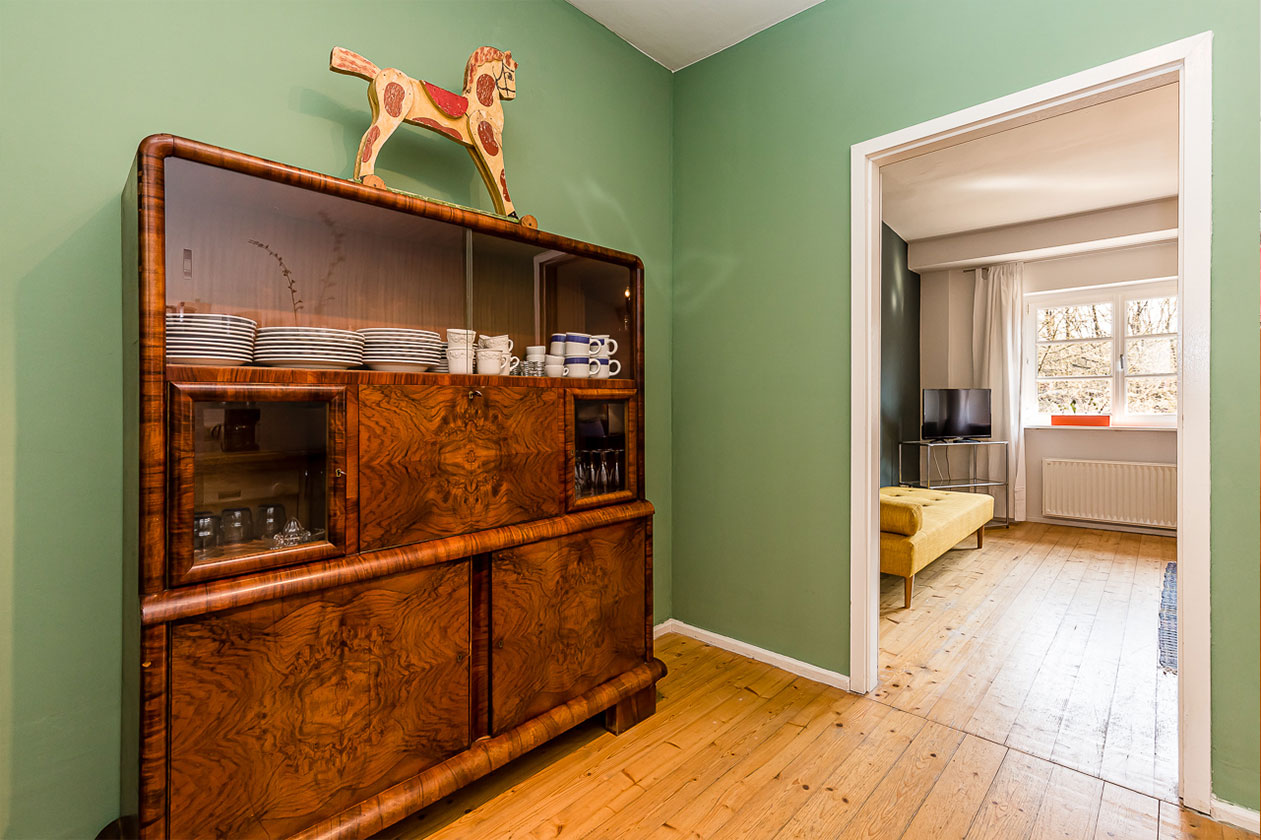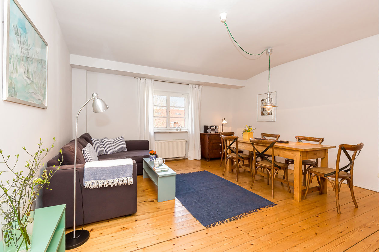 Unsere Ferienwohnung 5 bietet viel Raum und einen schönen Blick vom Wohnzimmer auf das Hofgeschehen. Kräftige Farben werden mit modernen Details und antiken Möbeln verbunden.