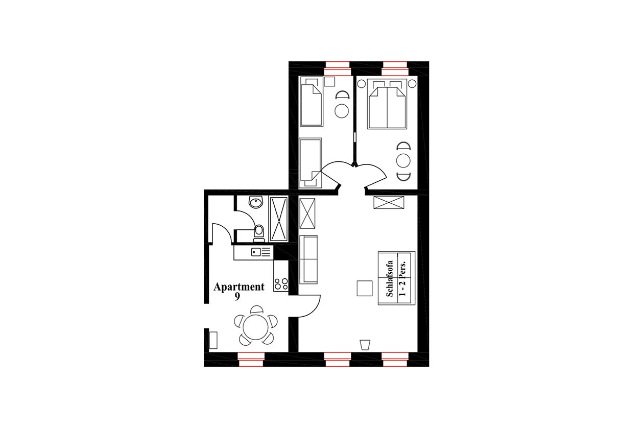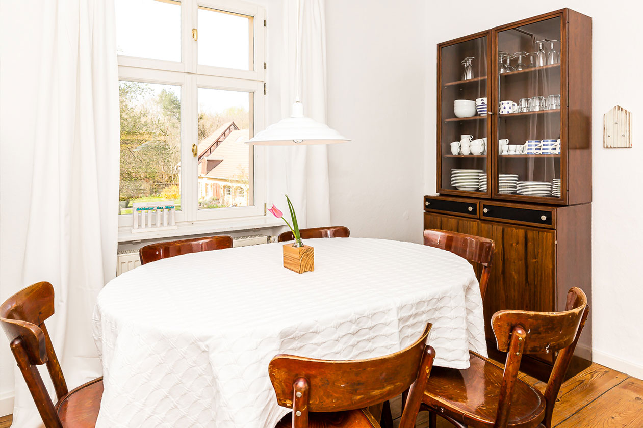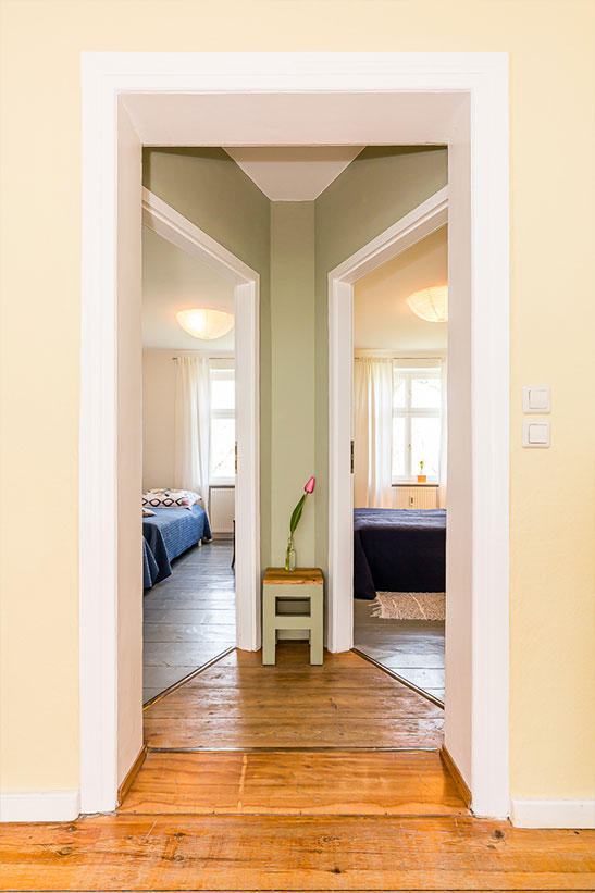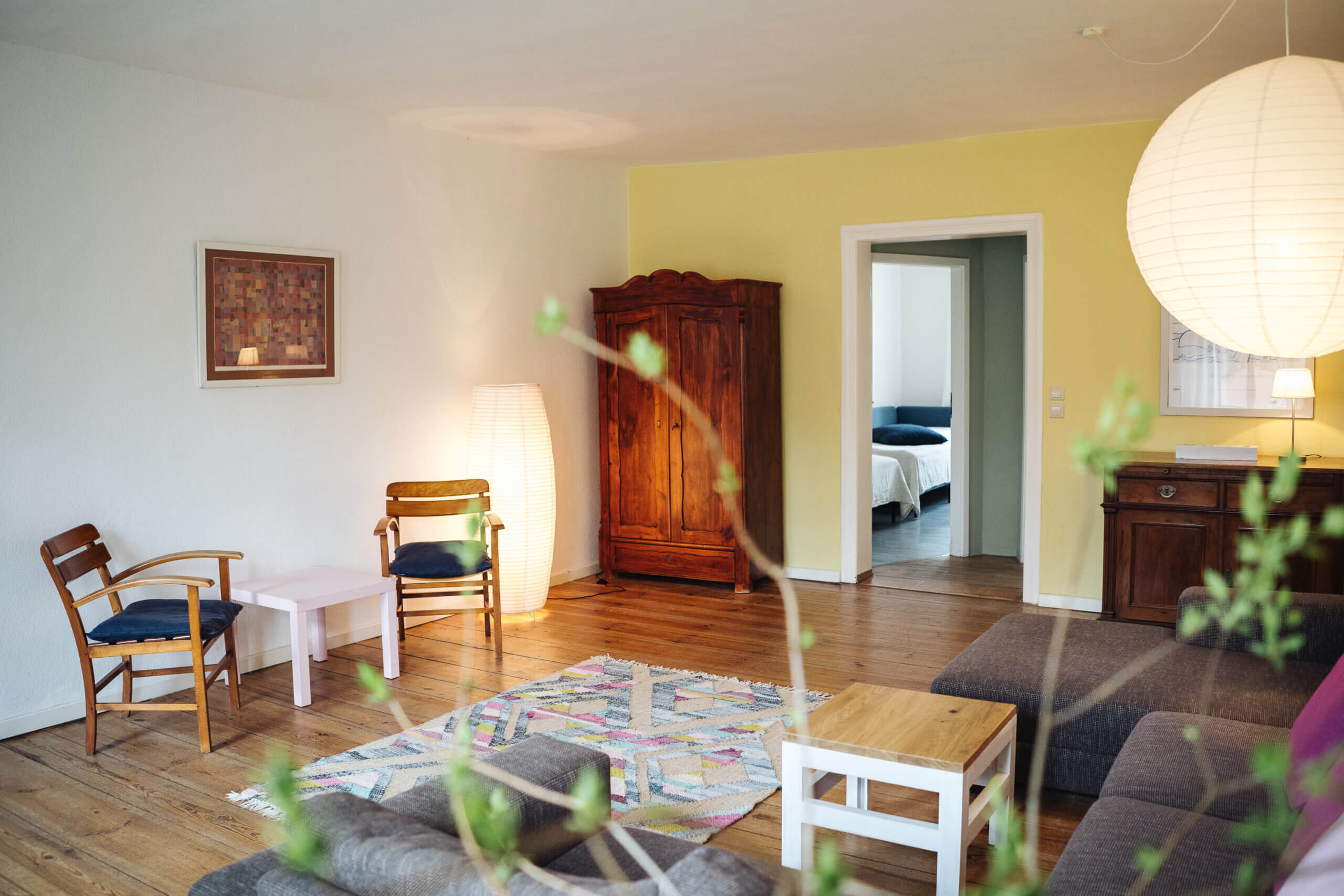 Aus dem 1. OG im alten Gutshaus hat man einen tollen Blick über den gesamten Innenhof. Mit großem Wohnraum, einer gemütlichen Küche und zwei getrennten Schlafzimmern bietet unsere Ferienwohnung 9 viel Platz für Freunde oder Familien.